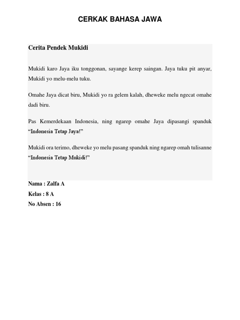 Biasanya dalam cerkak bahasa jawa akan memberikan sebuah pengaruh baik untuk kepada. Jadi cerkak bahasa jawa adalah cerita pendek yang disampaikan dengan menggunakan bahasa jawa. Pendidikan ingkang penting sanget inggih punika wawasan ugi akhlak budi pekerti, sebab sang saya majune zaman generasi penerus bangsa indonesia niki saya amburadul, saya rusak amargi kurang benteng ilmu agama ugi. Untuk mengenang kegigihannya, dinas kebudayaan kota. Hy sobat, kali ini saya akan berbagi informasi tentang cerito cekak bahasa jawa, nah bagi kalian yang masih duduk di bangku sekolah sudah pasti tahu soal cerito cekak bahasa jawa, karena itu saya akan memberikan contoh cerito cekak basa jawa, monggo disimak cerito cekaknya. Artikel bahasa jawa di bawah ini merupakan sebuah tips bagi kamu yang suku makan pedas mulai dari sambal hingga cabai. Alhamdulillah yen diparingi sehat, cobo wae bayangna yen suggih kabeh kabutuhan kecukupan. Sip bagus, kalau bisa tambah analisis unsur intrinsiknya juga ya. Cerkak bahasa jawa yaiku setunggaling karya sastra ingkang berbentuk prosa, gadhah sipat fiktif ingkang nyriyosaken setunggaling criyos ingkang saweg dipunalami setunggaling tokoh, ringkas lan ditumuti konflik ingkang dirampungaken kaliyan solusi saking masalah kasebat. Kosakata percakapan bahasa jawa translate sehari hari. Sipakguru.com kali ini akan membagikan cerkak bahasa jawa yang pernah di muat majalah panjebar semangat edisi 21 januari 2017 cerkak tema pendidikan yang berjudul baskoro ini mengisahkan tentang seorang siswa yang bernama baskoro, baskoro adalah salah satu siswa di sebuah yayasan. Joko….joko, wis rampung aduse durung! saking pakdhe darsono wis wanyel karo joko bodho, pakdhe darsono ora jawab pitakone joko bodho. .akan kembali membahas mengenai cerita cekak bahasa jawa, setelah sebelumnya kita membahas cerkak bahasa jawa yang bertemakan pendidikan.